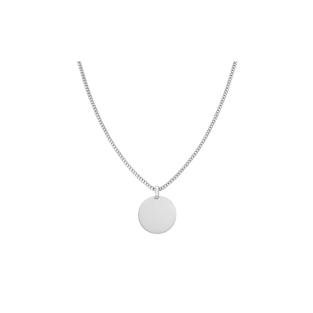 Collar plateado para hombre con dije circular. Diseño versátil y elegante en acero inoxidable resistente.