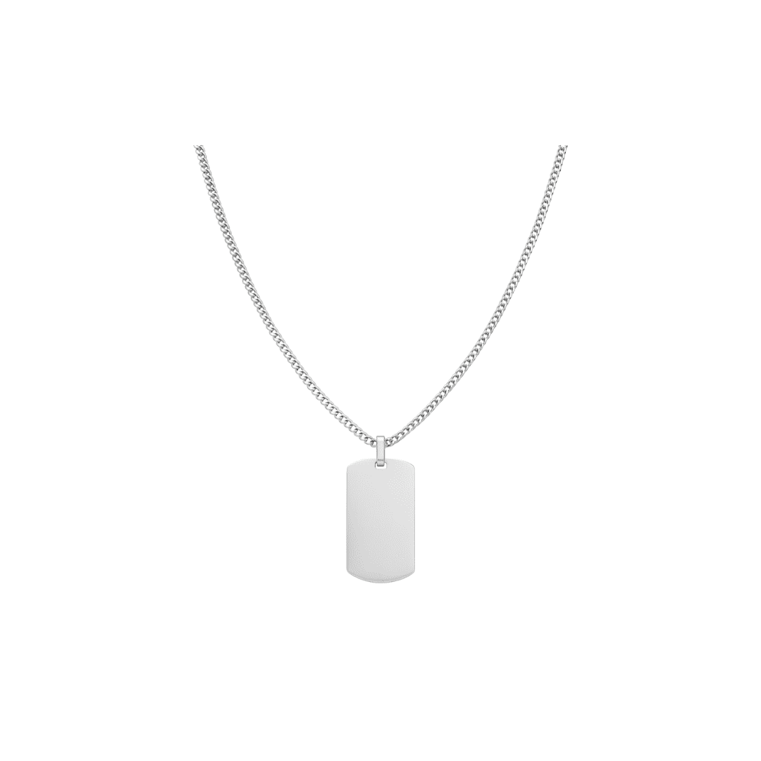 Collar plateado para hombre con dije tipo placa. Diseño versátil y resistente en acero inoxidable.
