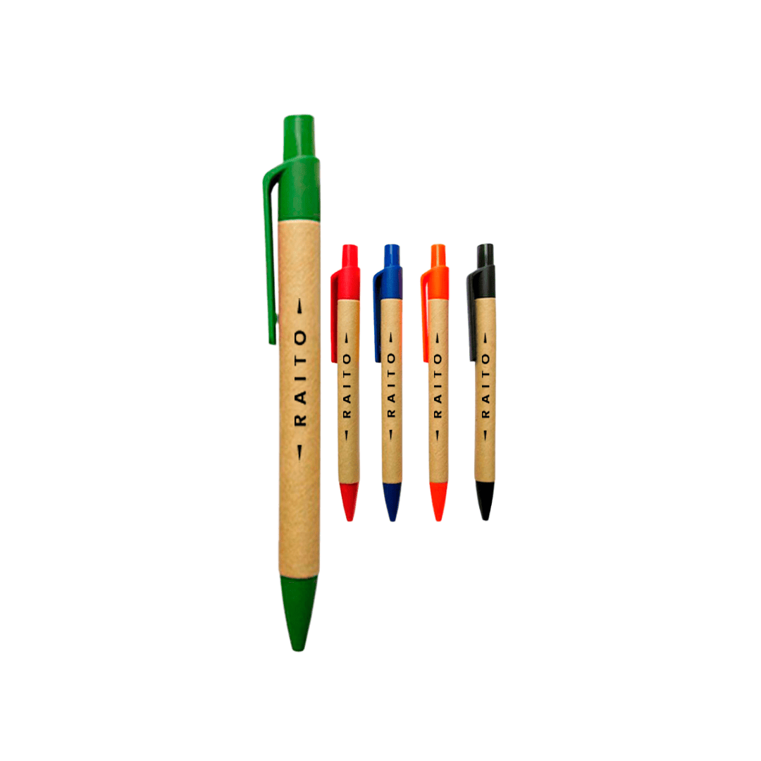 Lapicero con cuerpo de cartón reciclado y detalles en colores variados.