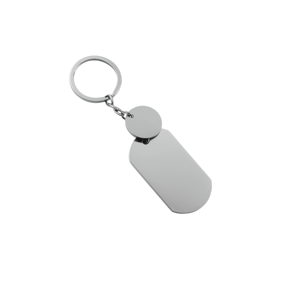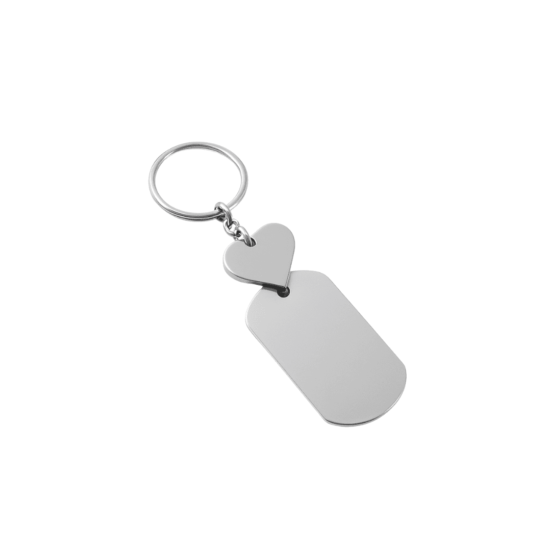 Llavero de acero inoxidable con dos dijes: circular y corazón. Resistente, elegante y personalizable.